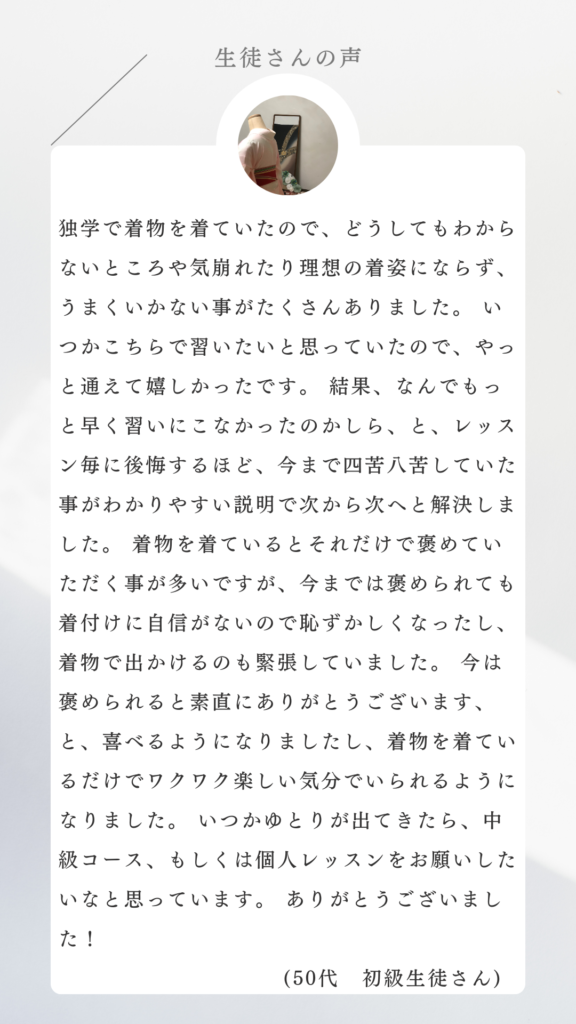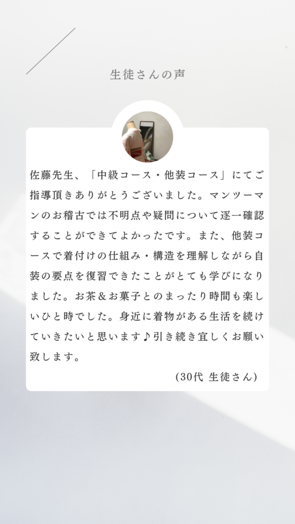 初級・中級レッスンを受講済み又は、既に着物を着ることができる方向けのレッスンになります。着付けでお困りな点や改善したいポイントについて原因と解決策をお伝えします。