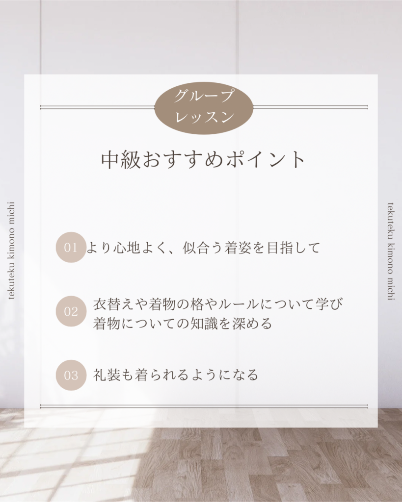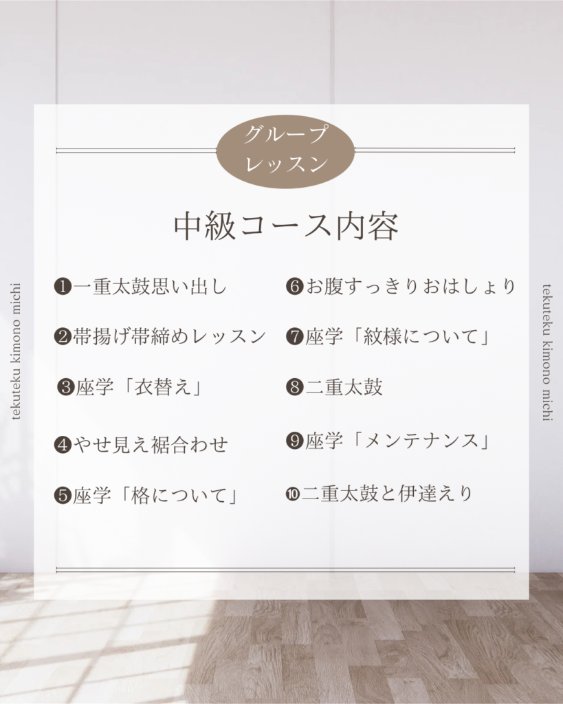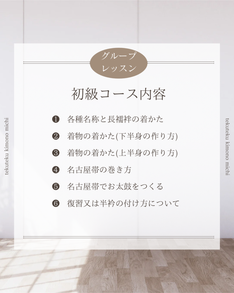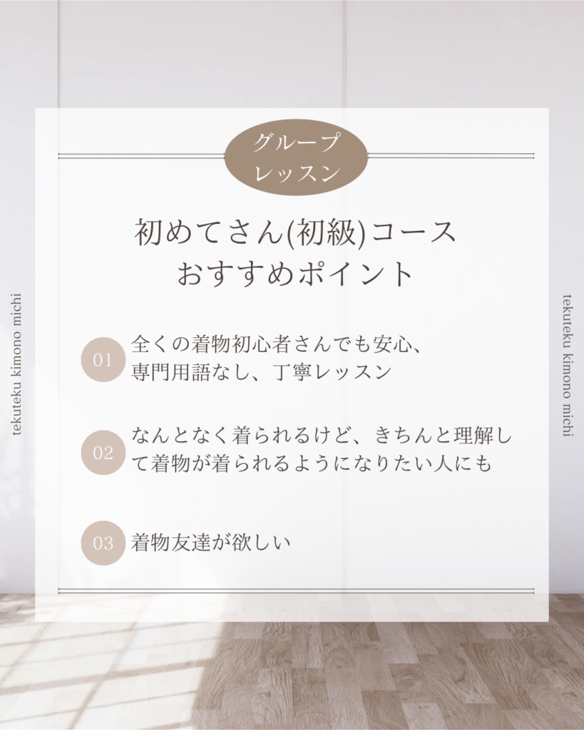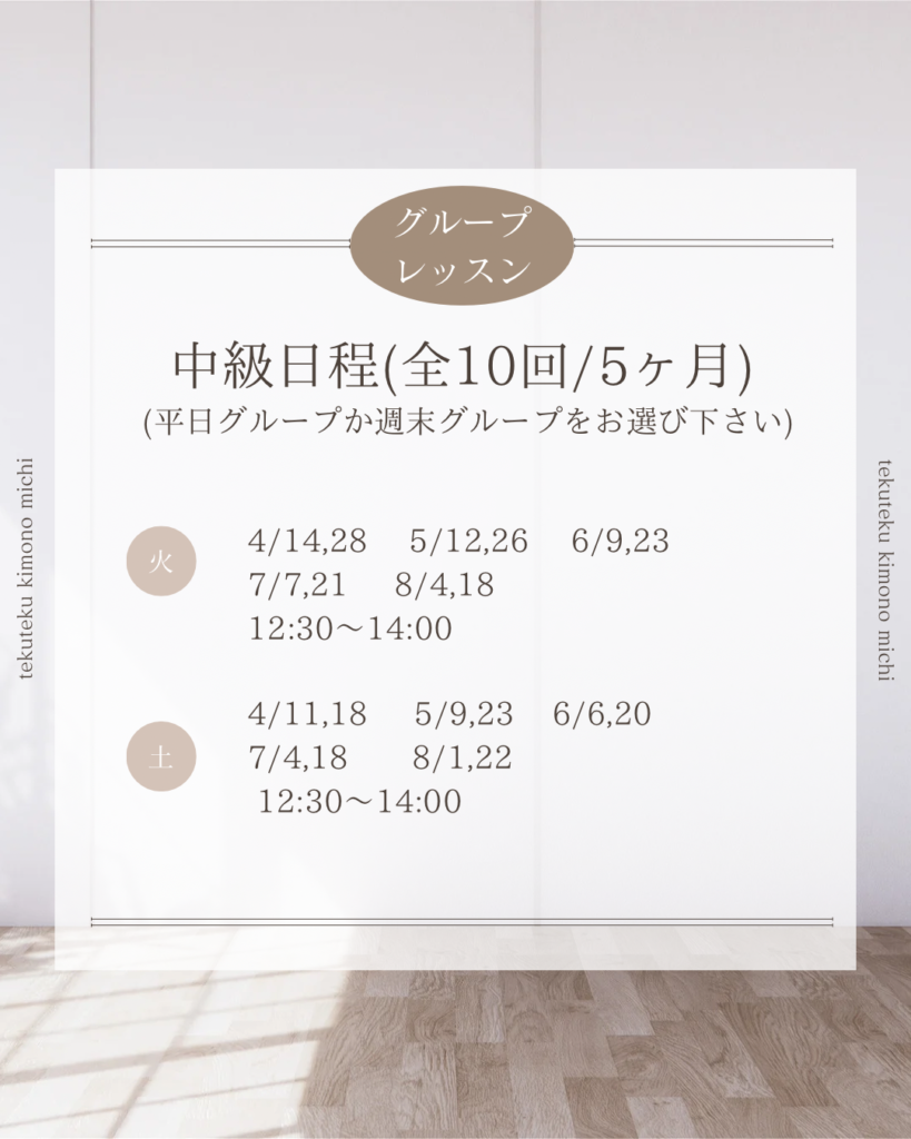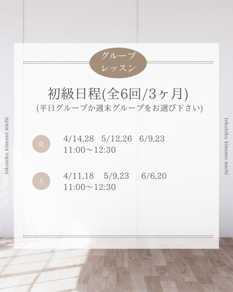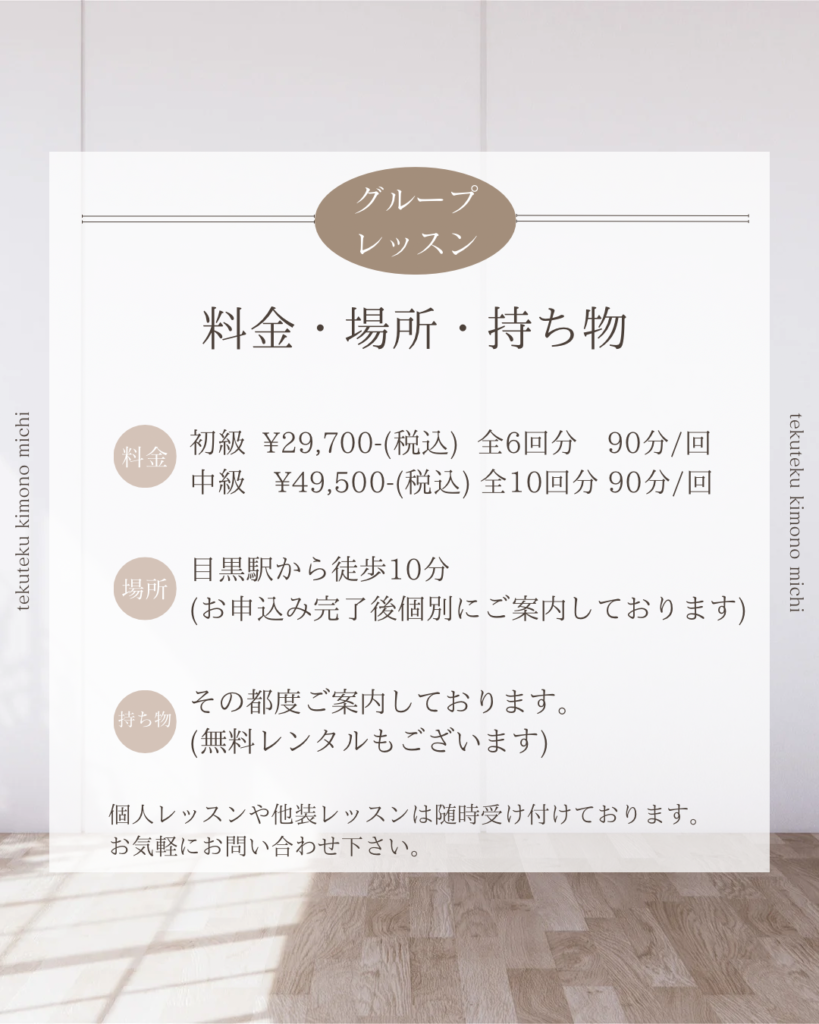 1月からは初級グループレッスン、中級グループレッスンがスタートします。着物を着てみたい!着物をもっと素敵に着こなしてみたい!と、新しい仲間が加わって下さいます。自分で着物が着られるようになると、世界がグッと広がりますよ!どうぞよろしくお願いいたします。(次回グループレッスンスタートは初級4月、中級8月になります。募集は一ヶ月前から開始します。公式LINEまたはインスタDM、メールinfo@tekutekukimono.jpよりご連絡下さい)